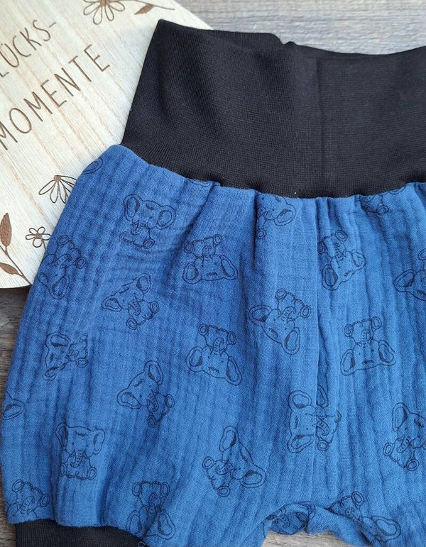 Wunderschöne kurze Pumphose "Elefant blau" perfekt für den Sommer aus Musselin in der Größe 80/86.