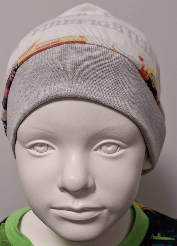 Wunderschöne Bündchen Mütze aus Jersey mit einem Feuerwehr Motiv, das Bündchen ist hellgrau.
