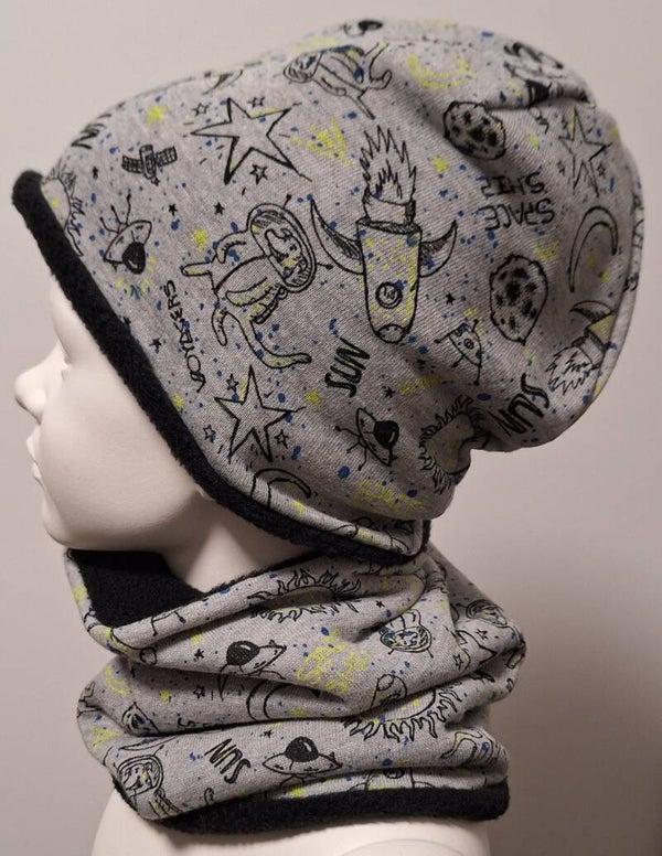 Wunderschöne Wende Beanie mit einem Raketen Motiv.